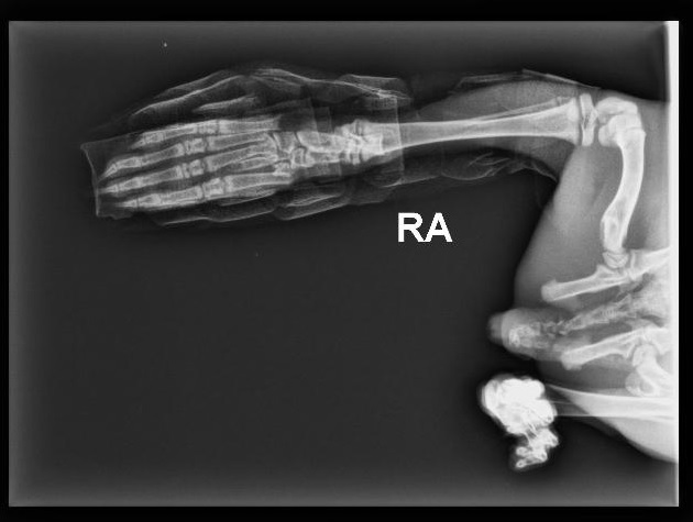 Een ontwrichting zien we gelukkig niet zo heel vaak. Deze kat had de pech dat 1 teen ontwricht was (de 2e teen van links). Hoe ze het voor elkaar heeft gekregen, is nog een raadsel!
