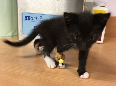 Veronica (Kaatje) is een jonge kat die 5 maanden geleden gebeten is door een hond in haar buik. Er werd een drain geplaatst om het wondvocht af te voeren, maar na een week begon alle huid af te sterven. Uiteindelijk bleef er een wond over van bijna 10x5cm. Ze is doorgestuurd naar de chirurgen van het Medisch Centrum voor Dieren in Amsterdam. De genezing verliep moeizaam en traag, vooral omdat de wond zich ook deels in de lies bevond; een locatie die lastig rustig te houden is bij de kat, zeker bij zo’n jong dier als Kaatje. Nu 5 maanden verder, is alles eindelijk genezen! Ze kan nu weer lekker genieten op schoot zonder romper aan!